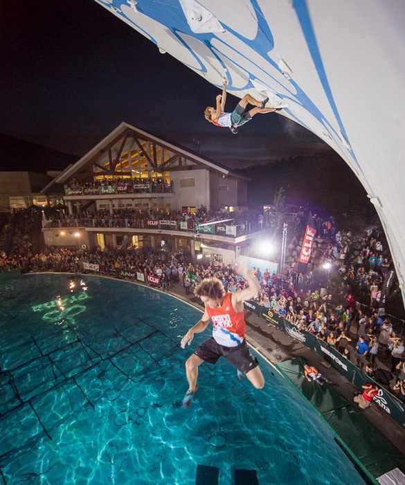 Задача спортсмена в Psicobloc – не только подняться вверх по наклонной стене с выступами, но и красиво упасть вниз в наполненный водой бассейн. А судьи засчитывают в финальном счете водного скалолаза обе этих дисциплины.