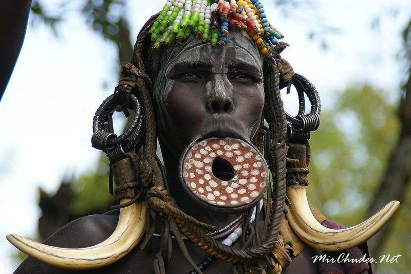 В Эфиопии обитает племя мурси, где особой популярностью пользуются диски для растягивания нижней губы. Как ни странно, это очень статусная вещь, которая говорит о привилегированности человека. Помимо этого, мурси верят, что диск на нижней губе препятствует негативному влиянию духов.