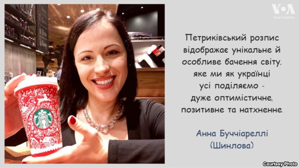 Украинская художница Анна Буччиарелли, живущая в Канаде, победила в конкурсе новогоднего дизайна для чашек Starbucks. Благодаря ей теперь элементы петриковской росписи можно встретить на чашках сети кофеен в 75 странах мира.