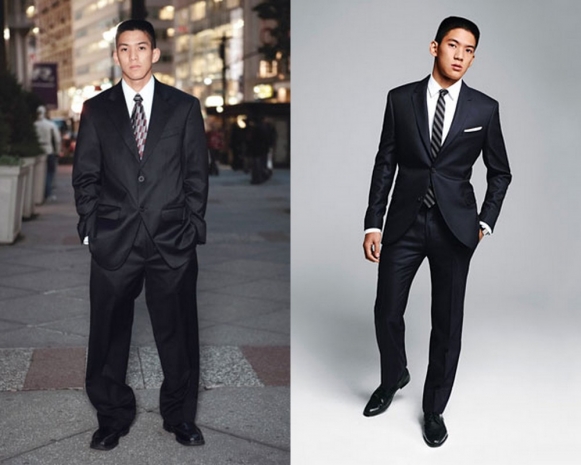 Откуда эта привычка покупать большемерные костюмы? Может это дань детству, когда мамы покупали костюмы «на вырост», или какая-то компенсация размеров по Фрейду. Точного ответа мы не знаем. Но одно известно точно: костюмы, как и любая другая одежда, должны соответствовать параметрам мужчины.