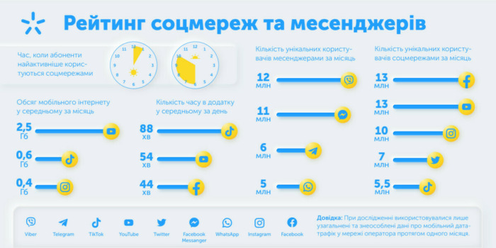 Киевстар проанализировал, какие мессенджеры, социальные сети и платформы пользуются наибольшей популярностью у абонентов, когда они активные и сколько мобильного интернета используют. При исследовании использовались обобщенные и обезличенные данные о мобильном дата-трафике в сети оператора.