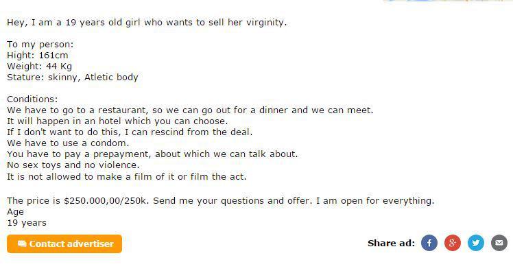 Некая 19-летняя жительница Австралии разместила на сайте Locanto объявление, где предлагала свою девственность за 250 00 австралийских долларов, что эквивалентно 145 000 американских долларов.