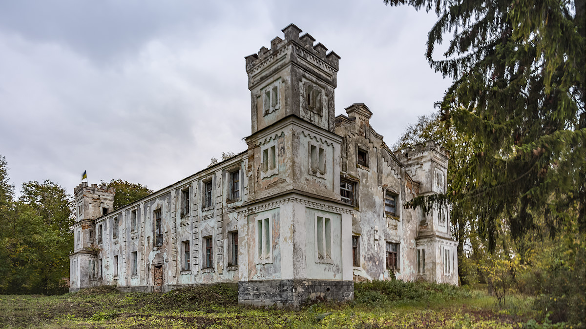 Из-за деревьев выглядывают зубчатые башни полуразрушенного, некогда величественного дворца. Это и есть усадьба Новицких в Слободке-Шелеховской на Хмельниччине.