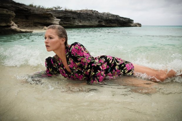 Манекенщица красовалась, лежа в воде в легких платьях с цветами и демонстрировала очень глубокое декольте, максимально обнажающее ее грудь.