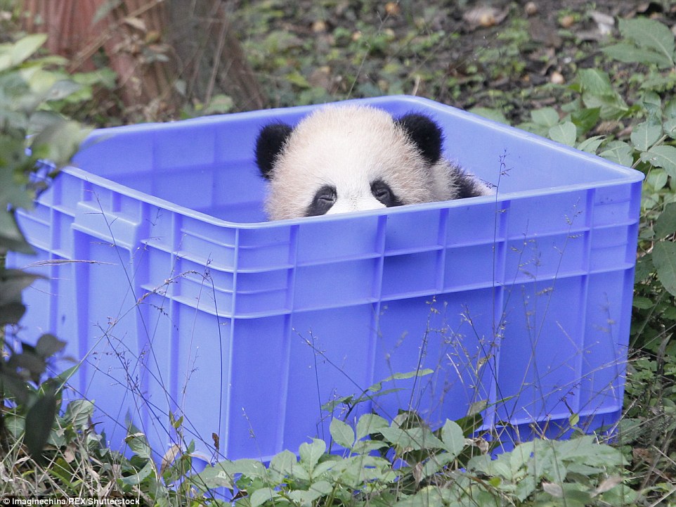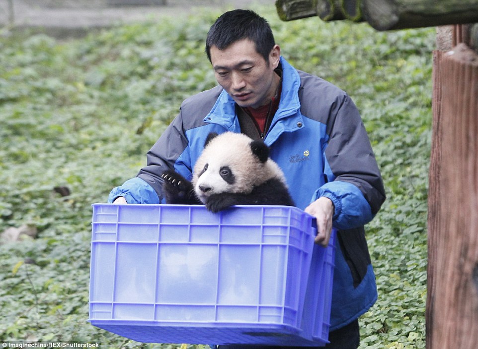 Малыш панды появился перед взволнованными посетителями совершенно внезапно. Работник зоопарка вынес пластиковый ящик, откуда робко начало выглядывать испуганное животное.