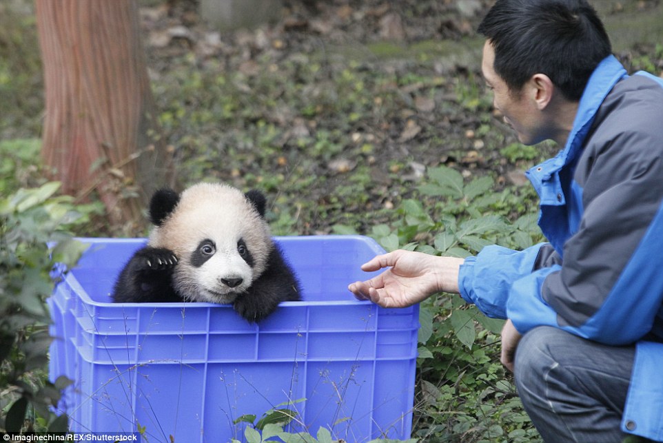Малыш панды появился перед взволнованными посетителями совершенно внезапно. Работник зоопарка вынес пластиковый ящик, откуда робко начало выглядывать испуганное животное.