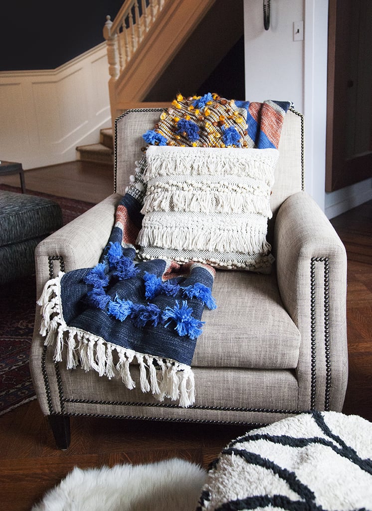 Не бойтесь сочетать текстильный декор с разным орнаментом, текстурой ткани и цветовой гаммой. Не обязательно отдавать предпочтение традиционным простым цветам, можно поэкспериментировать с разноцветными вещами разных фактур.