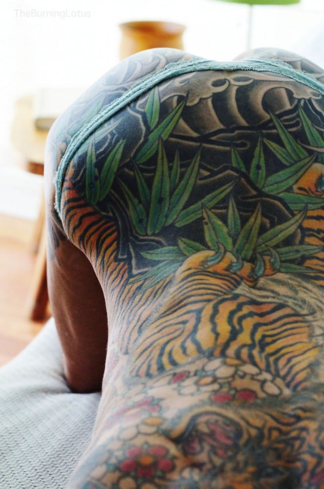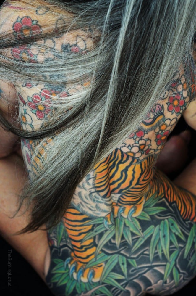 Спина, плечи ягодицы и часть бёдер модели покрыты разноцветными татуировками. Это придаёт экзотики её спортивному – не по возрасту – тему. Женщина активно занимается йогой. Одним из главных мотивов, по которым она опубликовала эти снимки стало желание показать, что женщина может быть сексуальной даже в таком возрасте.