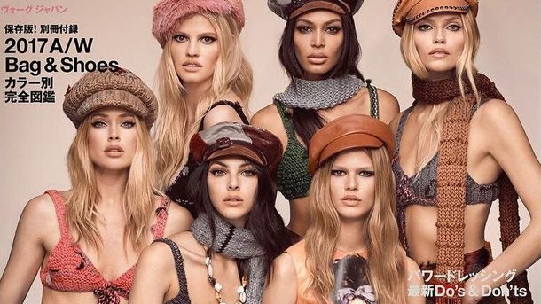 Шесть красивейших топ-моделей снялись полностью обнаженными для сентябрьского номера японского Vogue. Для дуэта фотографов Луиджи Мурено и Янго Хенци позировали Даутцен Крус, Лара Стоун, Наташа Поли, Виттория Черетти, Джоан Смоллс и Анна Юэрс. Красотки предстали в черных фуражках и красных ботфортах на голое тело.
