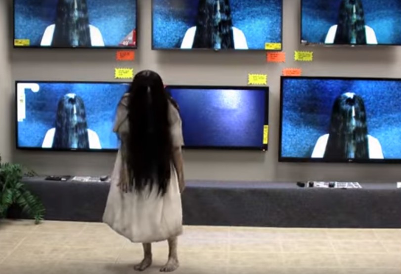 В нью-йоркском магазине бытовой техники провели пугающую рекламную кампанию. За одним из телевизоров спрятали монструозную девочку из ужастика «Звонок». Она неожиданно вылазила из экрана, когда клиенты выбирали телевизор.