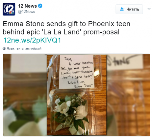 «Джейкоб, скромный подарок для тебя и твоей спутницы на выпускной. Хорошо проведи время. С любовью, Эмма Стоун», — написала она.