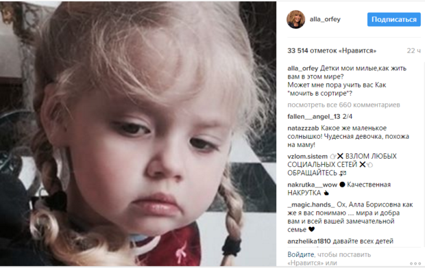 Пугачёва опубликовала запись в связи с терактами в Санкт-Петербурге. Этот пост собрал множество как положительных, так и критичных комментариев. Например, пользователь Magic.Hands оставил такие слова: «Ох, Алла Борисовна, как же я вас понимаю… Мира и добра вам и всей вашей замечательной семье». А, вот, Livona написала: «Дети маленькие — все хорошенькие! А вот с юмором у их так называемой матери плоховато… Климакс…»