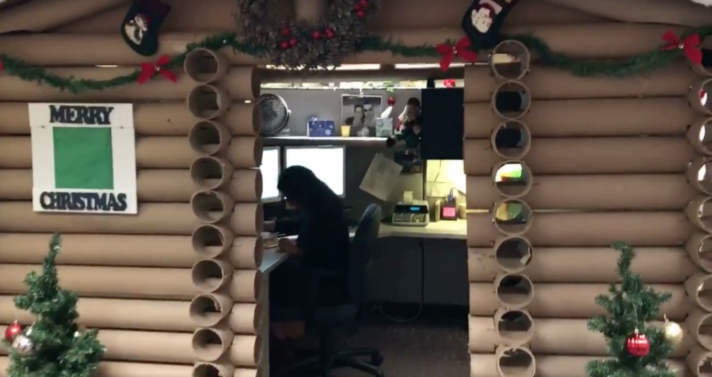 Сотрудница компании Toll Brothers Мелисса О’Нил соорудила вокруг своего рабочего стола декорацию новогоднего домика. Для этого она использовала подручные материалы: картонные трубы, ватный снег, искусственные ёлочки, бумажные окна.