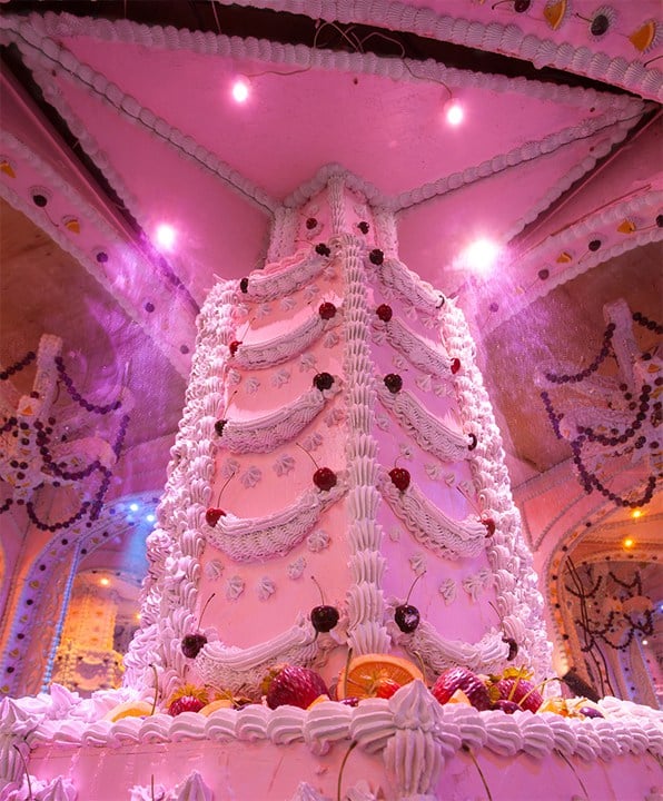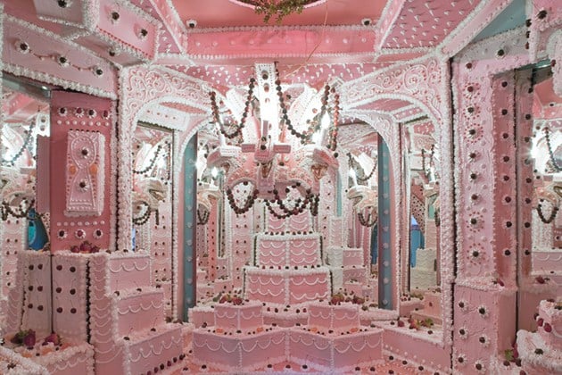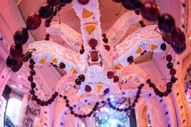 Инсталляция поместилась в шести огромных комнатах. Их стены на это время стали стенками кремовых пирожных, покрытых сливками, украшенных кусочками бутафорских фруктов и взятыми сливками. Это выглядит настолько аппетитно, что сложно поверить – все эти «лакомства» изготовлены из дерева и пластика.