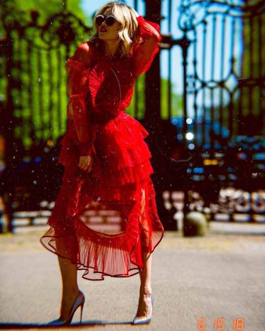 Она позировала в алом полупрозрачном платье с плиссе от бренда Надя Дзяк.
