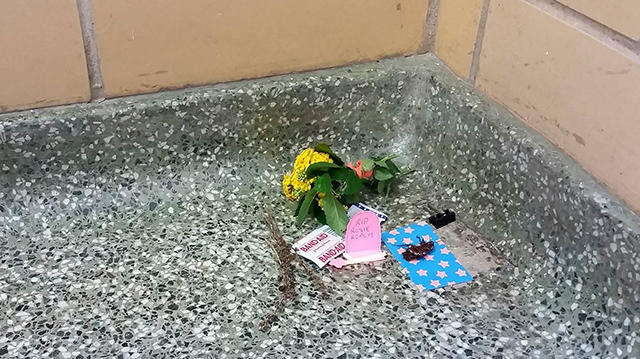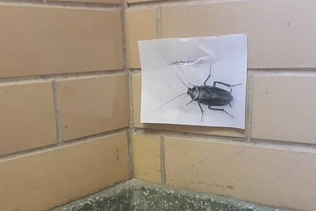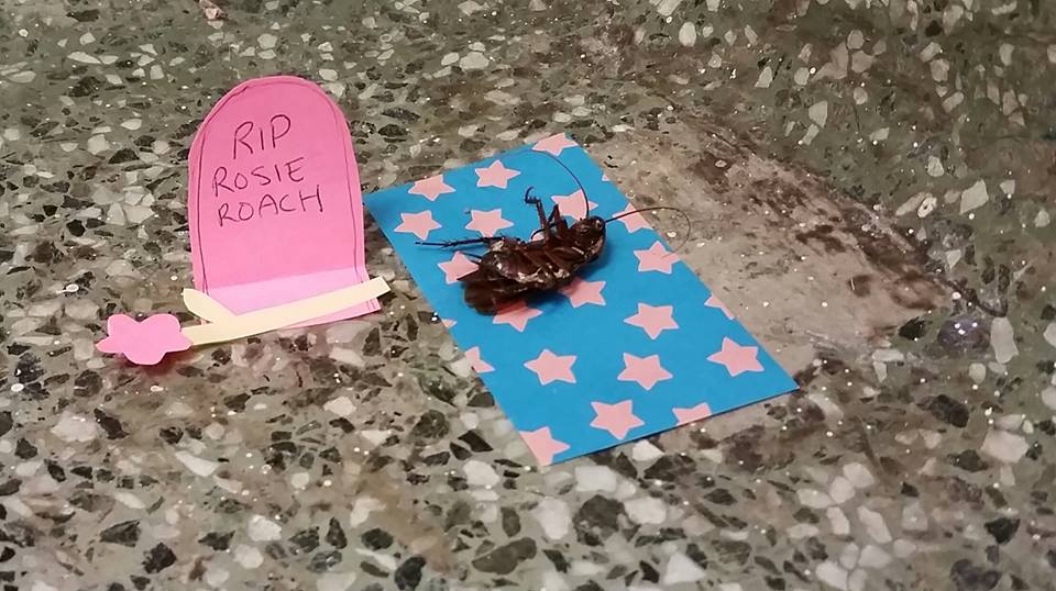 Таракан лежал незамеченным на лестничной клетке по меньшей мере две недели. После этого кто-то уложил насекомое на бумажный коврик, а рядом разместил надгробную табличку с надписью: «Покойся с миром, таракан Роузи». Затем у останков появились цветы и первые памятные предметы — зажим для бумаги и лейкопластырь.