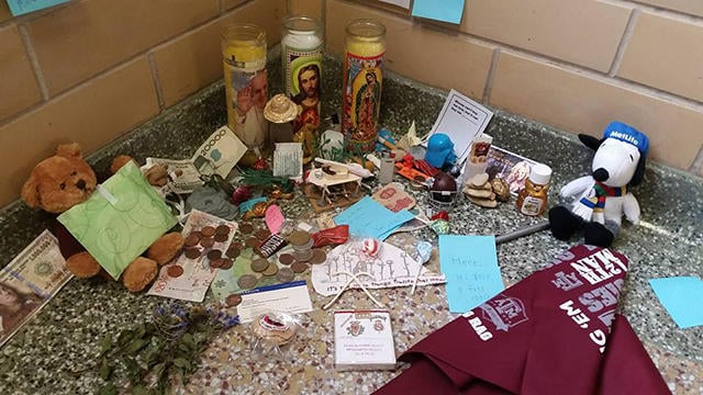 Мемориал продолжал разрастаться, в нем появились религиозные атрибуты и деньги. На стене вывесили объявление о дате прощания с Роузи и последующих поминках. На стене вывесили объявление о дате прощания с Роузи и последующих поминках.