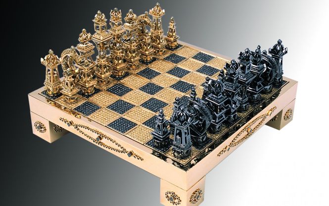 Набор под названием Royal Chess Set изготовлен из 18-каратного золота, а доска и фигуры инкрустированы желтыми и черными бриллиантами. На создание игрового поля ушло около 1,2 килограмма благородного метала и около 4,874 драгоценных камней, общим весом 125,5 карат, пишет Luxury Launches. Игровые фигуры впечатляют не только мелкой проработкой деталей, но и дизайнерским стилем.