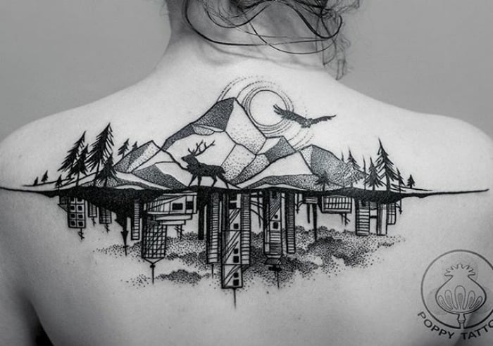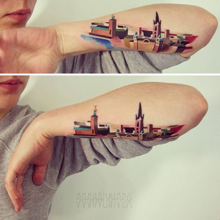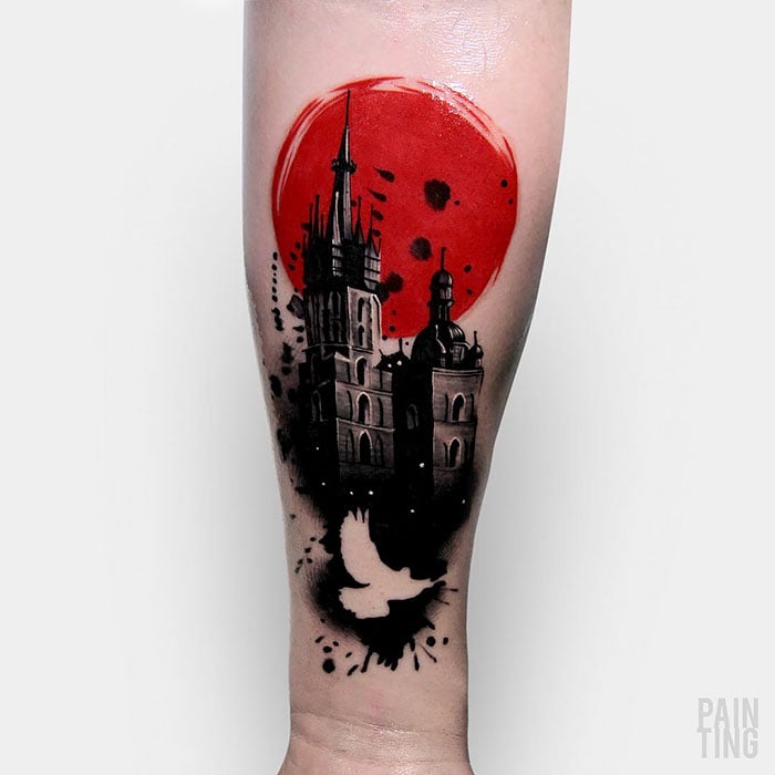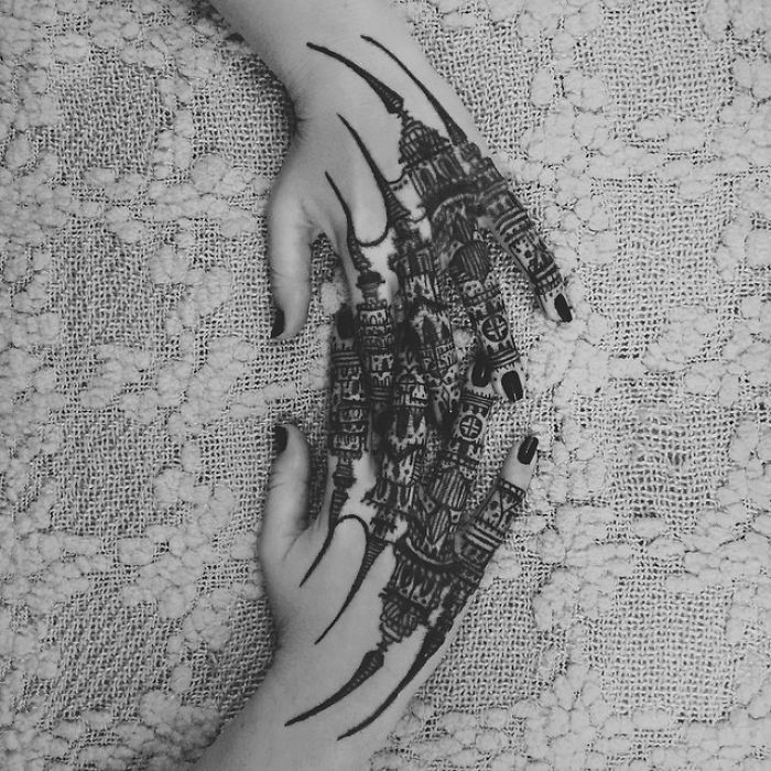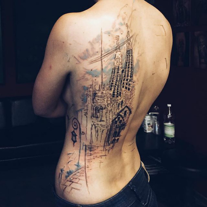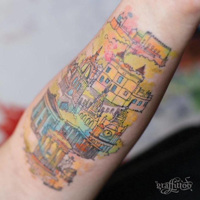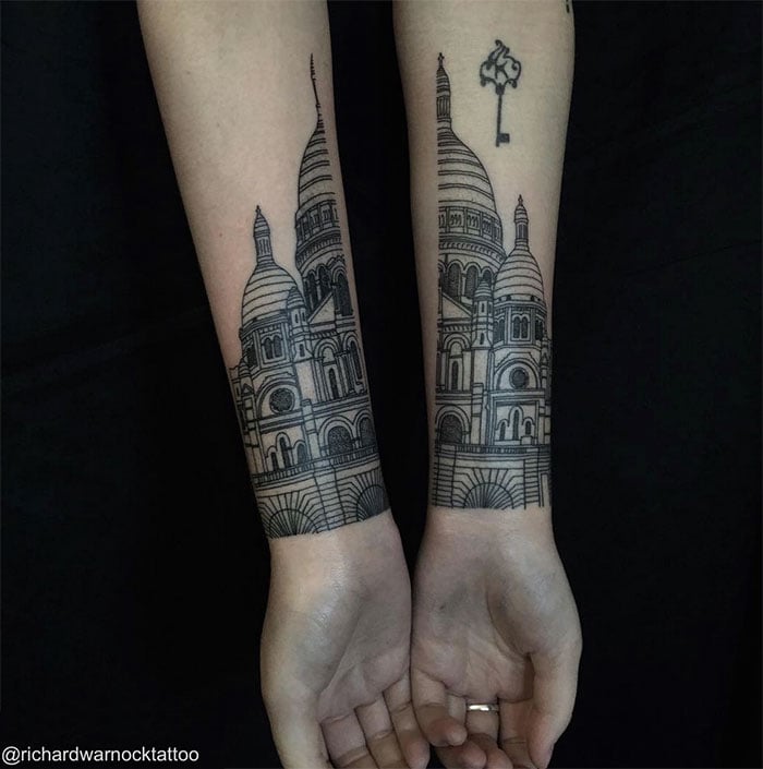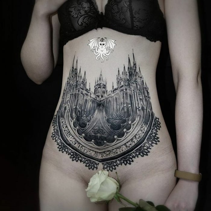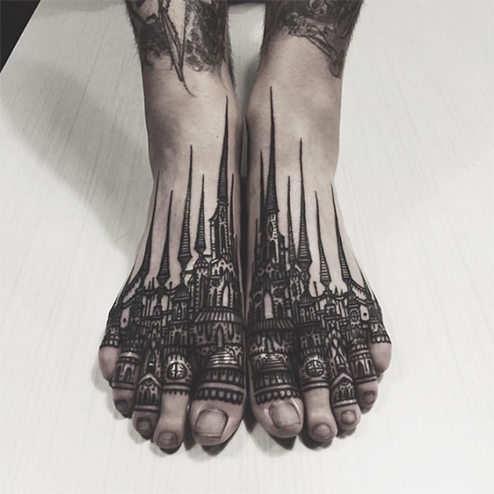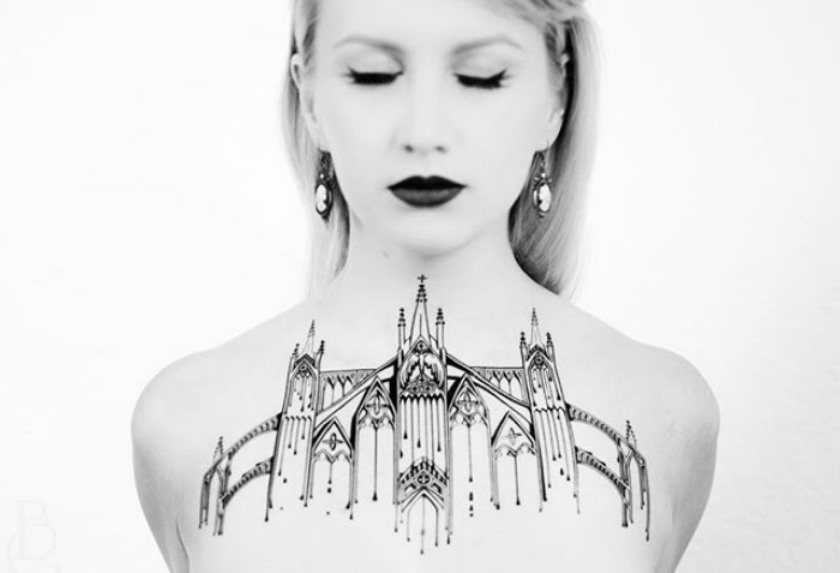 Татуировки, изображающие архитектуру стали новым модным трендом. Многие украшают своё тело изображениями готических соборов, дворцов и изысканных строений. Застывшая красота зодчества в таком случае гармонично сочетается с линиями тела.