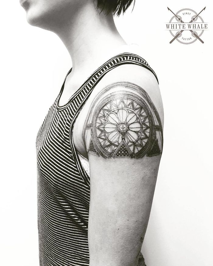 Ресурс Bored Panda составил подборку наиболее изысканных и стильных татуировок в таком духе. Многие из них выполнены минималистично. Ведь сдержанная красота линий в фасадах, колоннах, арках и сводах – самодостаточна. Татуировки, разрисованные разными цветами, также выглядят по-своему очаровательно.