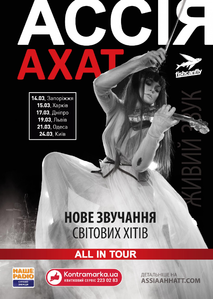 Украинская скрипачка и певица Ассия Ахат этой весной отправляется в тур по крупнейшим городам Украины в поддержку нового альбома All-In. Гастрольный вояж стартуют 14 марта и охватит шесть крупнейших городов страны — Львов, Одессу, Днепр, Харьков, Запорожье. Финальное выступление состоится в Киеве на главной столичной площадке – Дворце «Украина».