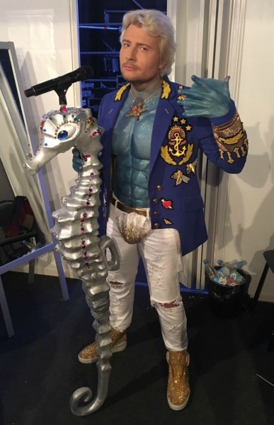 На сцену российский певец вышел в блестящем наряде, дополнив образ яркими перчатками с перепонками. Но внимание зрителей привлек другой аксессуар. Причинное место Басков стыдливо прикрыл перламутровой раковиной усыпанной стразами в тон брюкам.