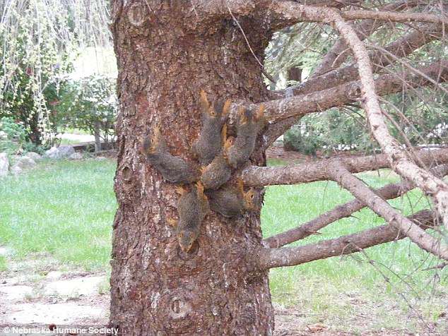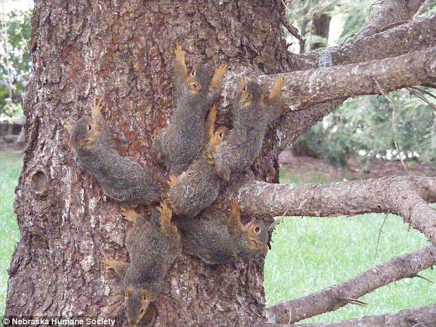 Житель штата Небраска услышал истошный визг у своего дома, и обнаружил, что звук издают восьминедельные бельчата, запутавшиеся пушистыми хвостами.
