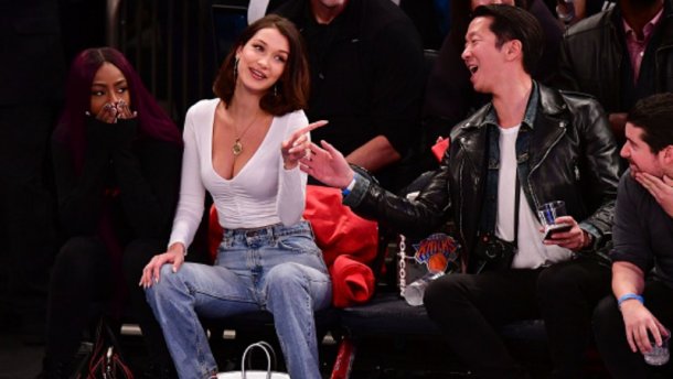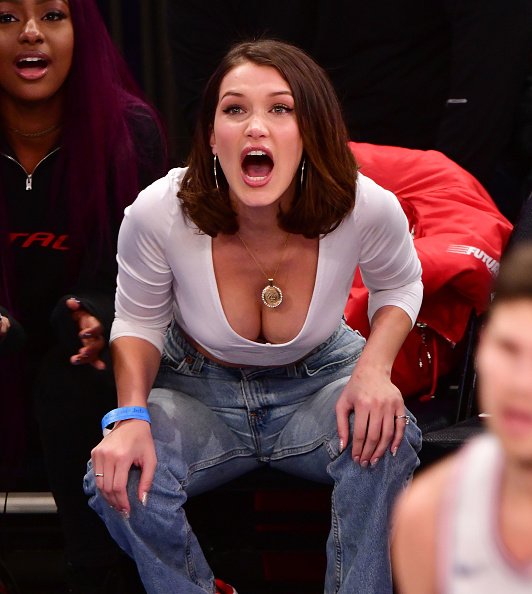 Белла Хадид наблюдала за игрой между «Нью-Йорк Никс» и «Лос-Анджелес Лейкерс» с первого ряда, одетая в футболку с огромным декольте.