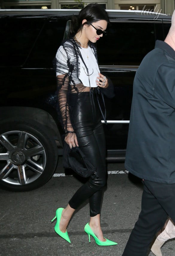 Кендалл надела обтягивающие кожаные брюки и короткий топ. В сочетании со странной прозрачной накидкой и салатовыми туфлями-лодочками ее наряд выглядел немного странно.