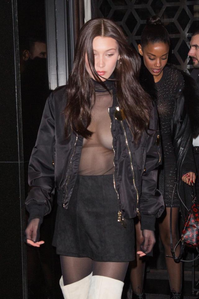 А вот ее коллега и приятельница Белла Хадид решила выставить свой роскошный бюст на показ, предпочтя прозрачную кофту.