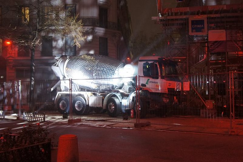 Французский дизайнер Бенедетто Буфалино создал инсталляцию, которая представляет из себя огромный дискошар, созданный на кузове бетономешалки. Для этого он обклеил вращающуюся часть её кузова кусочками зеркала. Оригинально украшенный строительный автомобиль находится во французском Лионе. Фотографии этой работы разошлись по сети вирусными темпами. В течение двух дней бетономешалка стояла на одном месте и в тёмное время суток действовала, как гигантский дискошар.