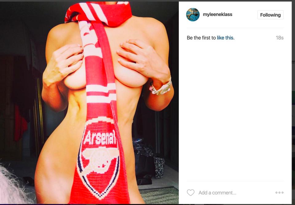 Известная британская актриса, модель и ведущая Майлин Класс разделась в поддержку любимой футбольной команды «Арсенал». Ярая болельщица полностью обнажилась на камеру, прикрывшись лишь шарфом с логотипом своих кумиров.