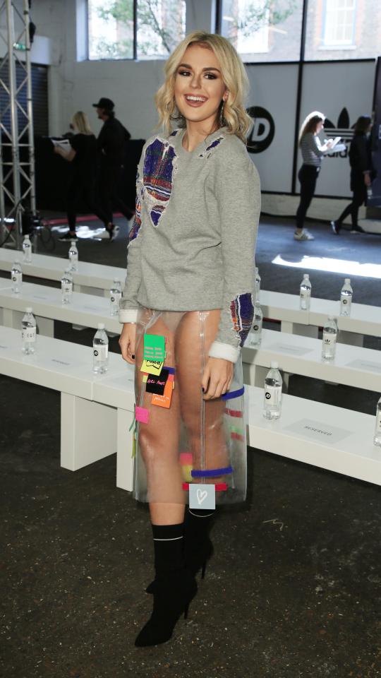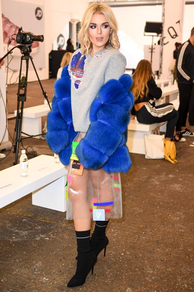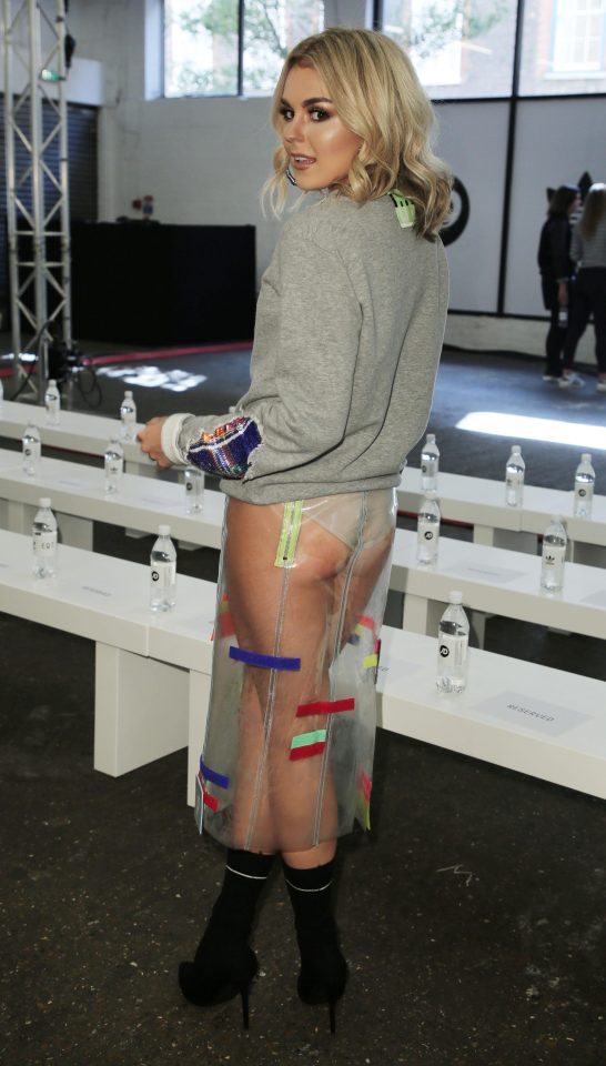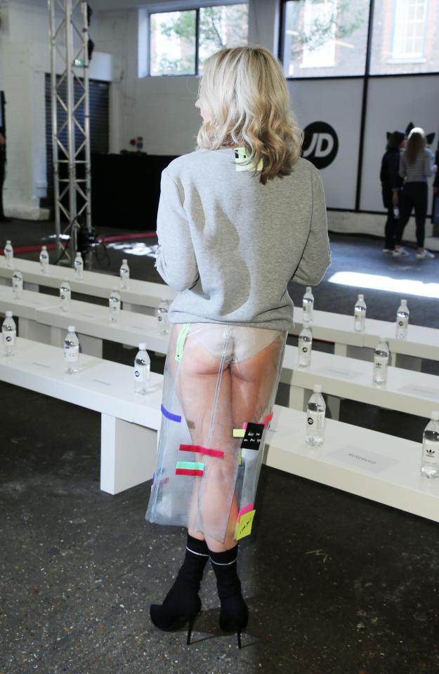 Британская певица Талия Сторм заявилась на Неделю моды в Лондоне в прозрачной целлофановой юбке, сквозь которую были отчетливо видны ее трусики. Кроме того , на экстравагантный наряд она наклеила стикеры с пометками.