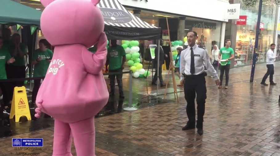 Полицейские лондонского района Кингстон-апон-Темс приняли участие в благотворительном танцевальном марафоне. Офицер Дэн Грэм вышел танцевать против соперника, одетого в костюм розовой свиньи. И отлично выступил.
