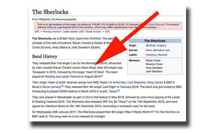 Подросток из Британии Адам Бойд подделал страничку любимой шеффилдской группы The Sherlocks в Википедии. Там он написал, что является родственником вокалиста команды. Охранники поверили парню и пропустили его в VIP-зону. В качестве доказательства парень показал на смартфоне страничку группы в энциклопедии, которую он предварительно отредактировал так, как ему было выгодно. В частности, он написал, что участвовал в записи первого сингла группы Live for the moment.