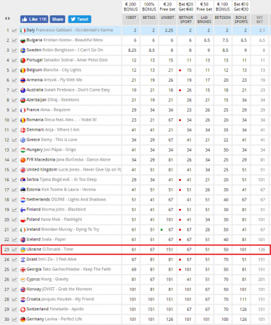 Учитывались ставки от европейских букмекеров. Результаты такого голосования были опубликованы на официальном сайте «Евровидения-2017».