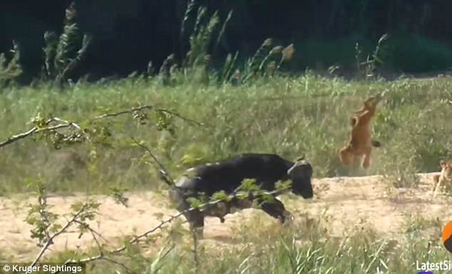 Так произошло с ящерицей, которую схватил в зубы один из львов стаи. Шесть хищников хотели поживиться добычей, но внезапно им помешал бык.