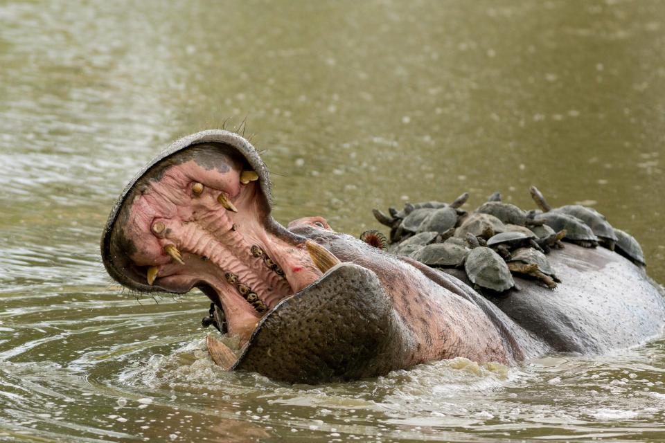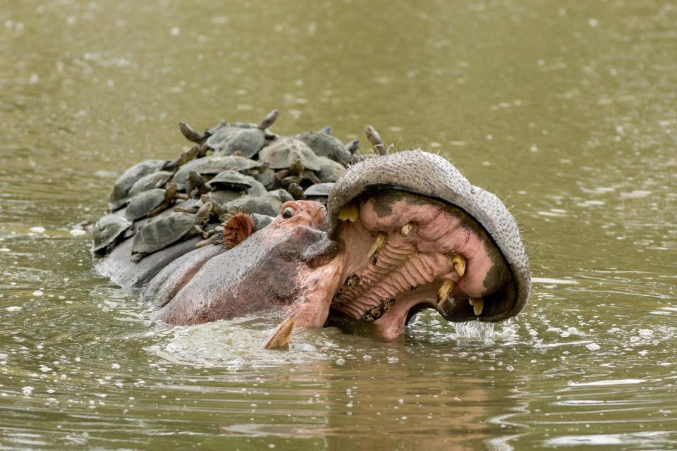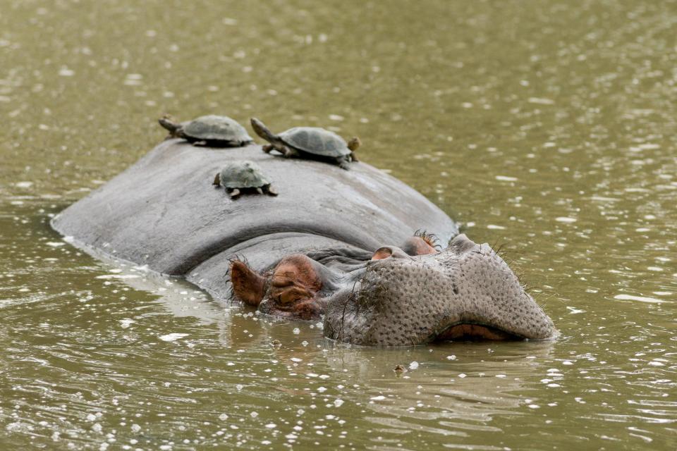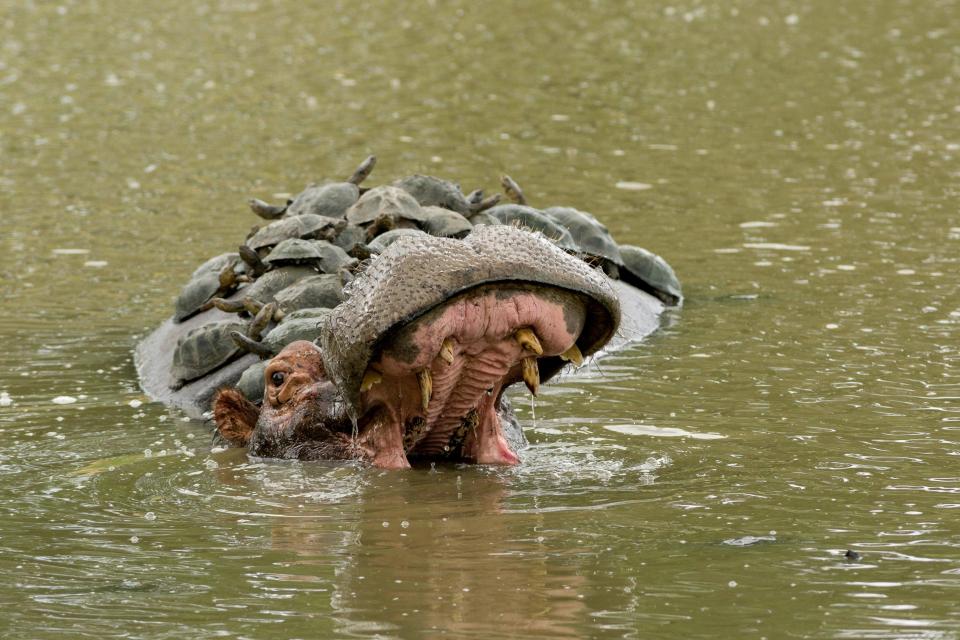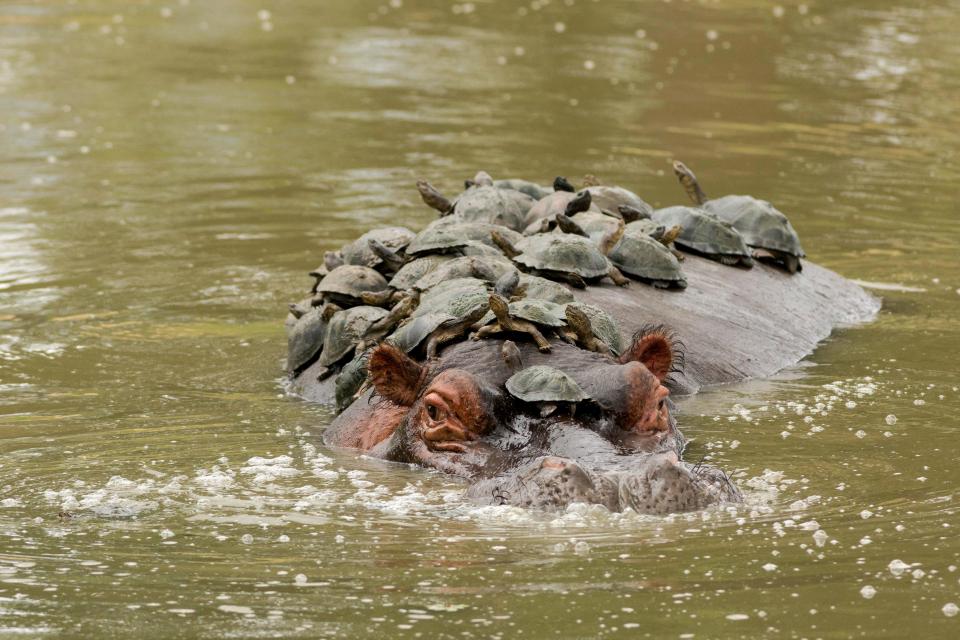 Курьезные фото гиппопотама, которого со всех сторон обложили черепахи, стало популярным в Сети.