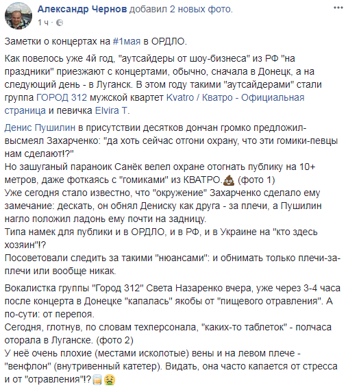 «Вчера, уже через 3-4 часа после концерта в Донецке «капалась» якобы от «пищевого отравления». А по-сути: от перепоя. Сегодня, глотнув, по словам техперсонала, «каких-то таблеток» — полчаса оторала в Луганске. У неё очень плохие (местами исколотые) вены и на левом плече — «венфлон» (внутривенный катетер). Видать, она часто капается от стресса и от «отравления», — подчеркнул Чернов.