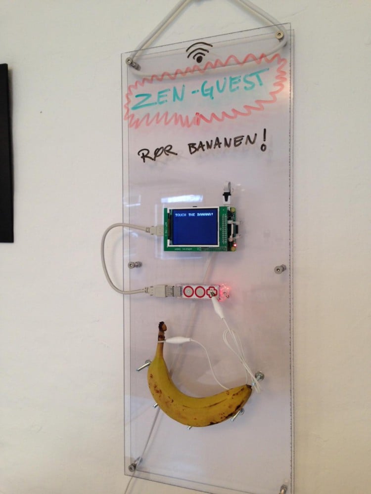 Инженер неназванной датской компании Стефан Мило собрал установку, раздающую временные пароли от гостевого Wi-Fi после прикосновения к банану. Работает это именно так, как описано: гость должен дотронуться до банана, после чего на экране высвечивается пароль.