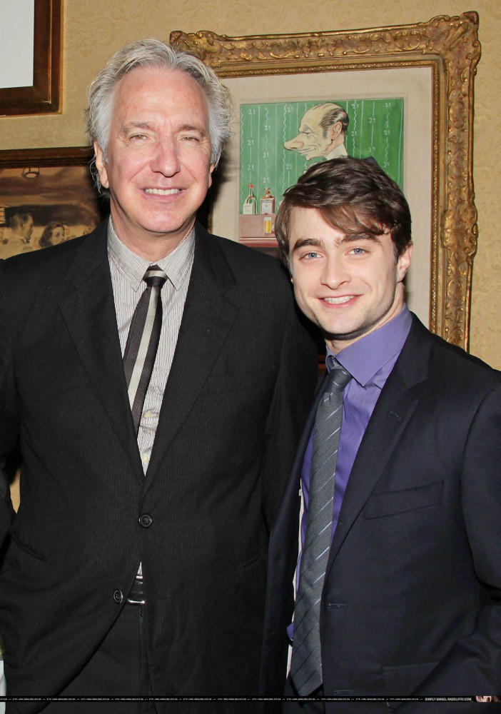Он поведал, что Рикман для него был и остается одним из величайших актеров, профессионалов своего дела, с которым ему доводилось когда-либо работать. Рэдклифф рассказывает, что старший коллега очень поддерживал его на съемках «Гарри Поттера», а потом приходил посмотреть на театральные постановки, где участвовал Дэниел.