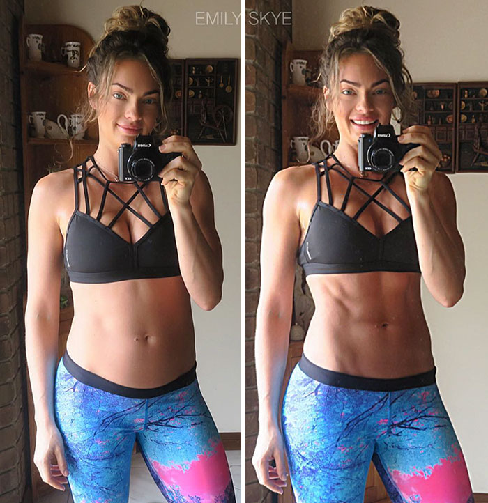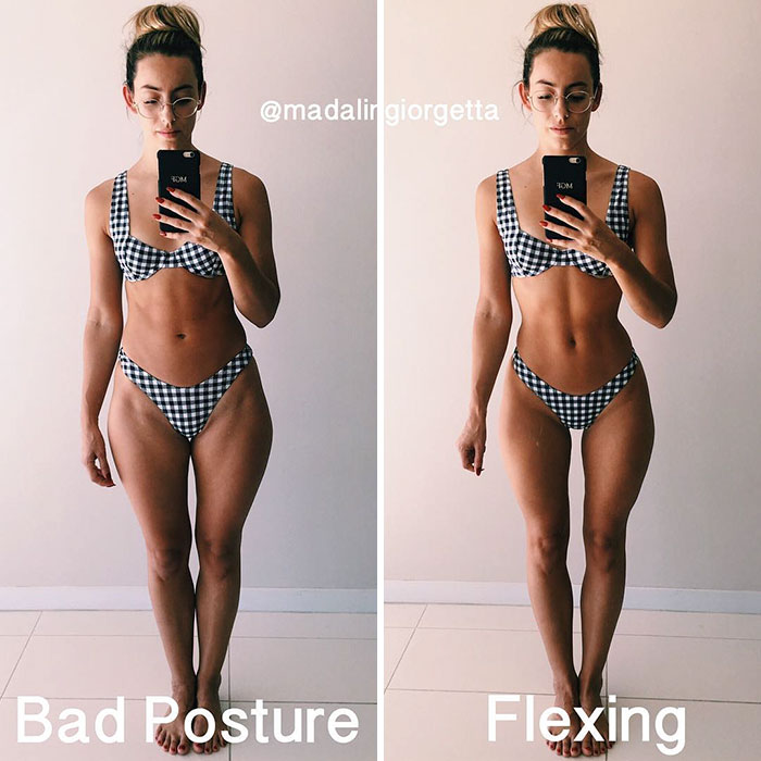 Ресурс Вored Рanda составил подборку фотографий, на которых девушки со спортивной фигурой показывают своё тело в разных ракурсах, отчего может сложиться впечатление, что между снимками были месяцы занятий в фитнес-зале. На самом же деле на одном снимке девушки просто расслабились, а на другом – втянули живот, подтянули бёдра и отвели таз чуть назад. Отчего их фигура приобрела более привлекательные очертания.