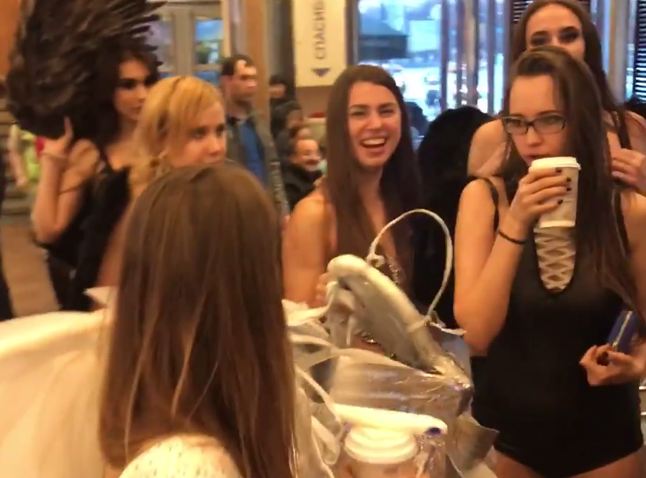 Группа из шести девушек, облаченных лишь в сексуальное нижнее белье и чулки, нагрянула в один из московских McDonald’s.
