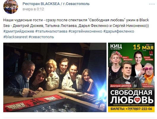 «Наши чудесные гости — сразу после спектакля «Свободная любовь» ужин в Black Sea — Дмитрий Дюжев, Татьяна Лютаева, Дарья Фекленко и Сергей Никоненко», — пишется на странице ресторана.