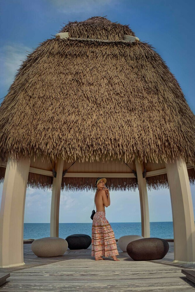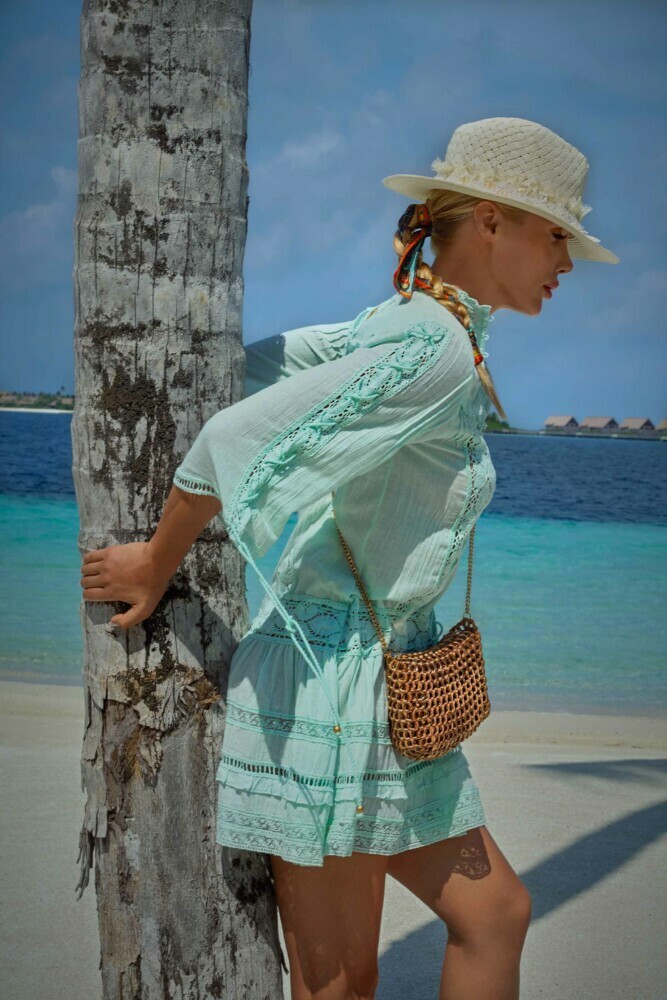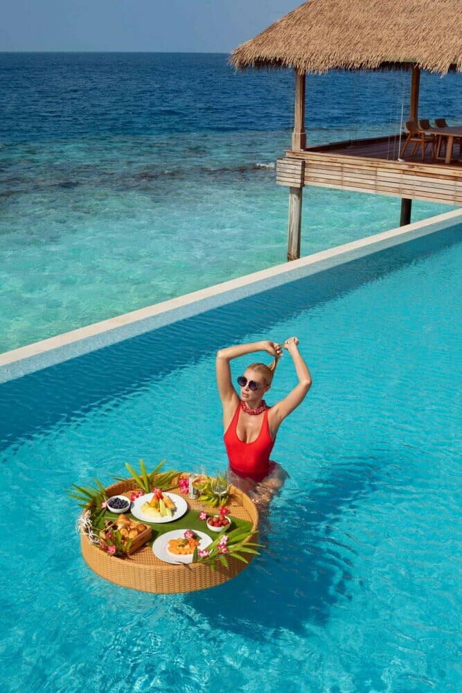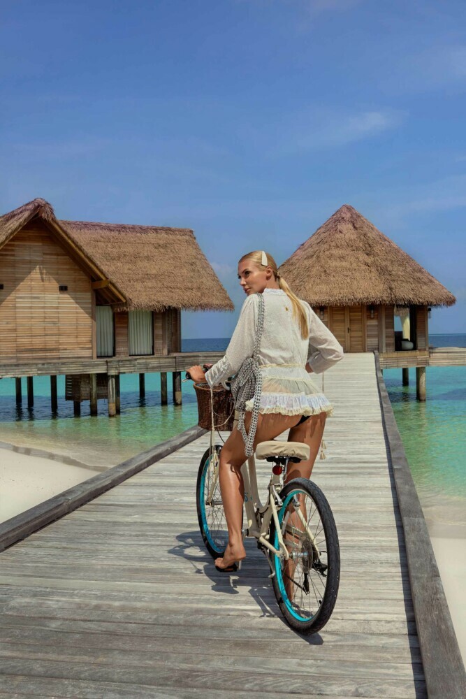 В спортзале Анна Гомонова позирует в черном костюме, состоящем из топа и мини-шортов, а сверху полупрозрачная желтая майка. Дополняет модный лук сумочка через плечо. Придает атмосферность фото и вид на океан, открывающийся из спортзала. А вот одно из фото иллюстрирует как можно позавтракать на Мальдивах. Анна позирует в бассейне в красном купальнике, солнцезащитных очках и стильных серьгах. На фото девушка расслабляется и наслаждается атмосферой. Завтрак на плавающем подносе – фрукты, ягоды, шампанское. На другом фото, в бассейне, модель одета в чёрный сплошной купальник с отделкой-жабо, на голове – платок, повязанный как тюрбан, а на шее – бусы. Это фото особенное – на нем фотограф наполовину погрузил камеру под воду и половину кадра снял над водой. Получился очень эффектный снимок! И конечно же, в фэшн-съёмку вошел кадр на песке – Анна Гомонова одета в тунику с принтом, лежит на краю лазурного океана и песчаного пляжа.