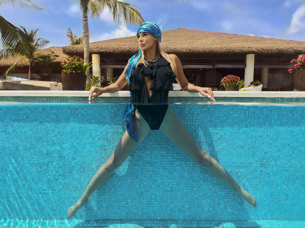 В спортзале Анна Гомонова позирует в черном костюме, состоящем из топа и мини-шортов, а сверху полупрозрачная желтая майка. Дополняет модный лук сумочка через плечо. Придает атмосферность фото и вид на океан, открывающийся из спортзала. А вот одно из фото иллюстрирует как можно позавтракать на Мальдивах. Анна позирует в бассейне в красном купальнике, солнцезащитных очках и стильных серьгах. На фото девушка расслабляется и наслаждается атмосферой. Завтрак на плавающем подносе – фрукты, ягоды, шампанское. На другом фото, в бассейне, модель одета в чёрный сплошной купальник с отделкой-жабо, на голове – платок, повязанный как тюрбан, а на шее – бусы. Это фото особенное – на нем фотограф наполовину погрузил камеру под воду и половину кадра снял над водой. Получился очень эффектный снимок! И конечно же, в фэшн-съёмку вошел кадр на песке – Анна Гомонова одета в тунику с принтом, лежит на краю лазурного океана и песчаного пляжа.