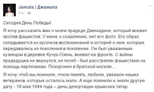 Джамала написала трогательное послание ко Дню Победы и рассказала о своем храбром парадеде Джемадине, который помогал партизанам, за что и был расстрелян во время Второй мировой войны. Украинская певица призвала всех помнить подвиг ветеранов.