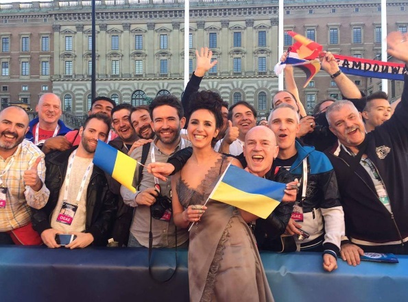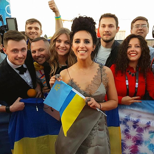 Все участники прошлись по традиционной «красной дорожке»»Евроклуба». В их числе была и конкурсантка от Украины. Джамала выбрала для выхода в свет изысканное шелковое платье кофейного цвета. В руках она держала флаг родной страны.