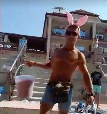 Мужчина с обнаженным торсов и ушами зайца продавал креветки. Видео опубликовала Мила Лобачева в Facebook.