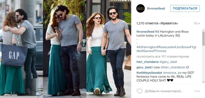Герои полюбившегося многим сериала «Игры престолов» Джон Сноу и Игритт в лице актеров Кита Харрингтона и Роуз Лесли крутят роман не только на экране, но и в жизни.